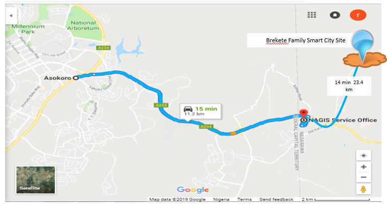 Brekete Family Smart City is located in Chakuwa, Gurku, Karu Local Government (Nasarawa State) along the Panda – Jetata road. This is the old expressway that leads to Jos /Bauchi from Abuja. For a descriptive landmark, it is on the Mpape axis of the boundary between Abuja and Nasarawa. The site is about 13 kilometers to Maitama (line of site) but 17 km on road following the upcoming Panda –Jetate road, and 23.4km on road from Asokoro, following Nyanya /Mararaba Road. Comparatively, it is about the same distance from Abuja Central Area to Kuje Junction, along the airport road.